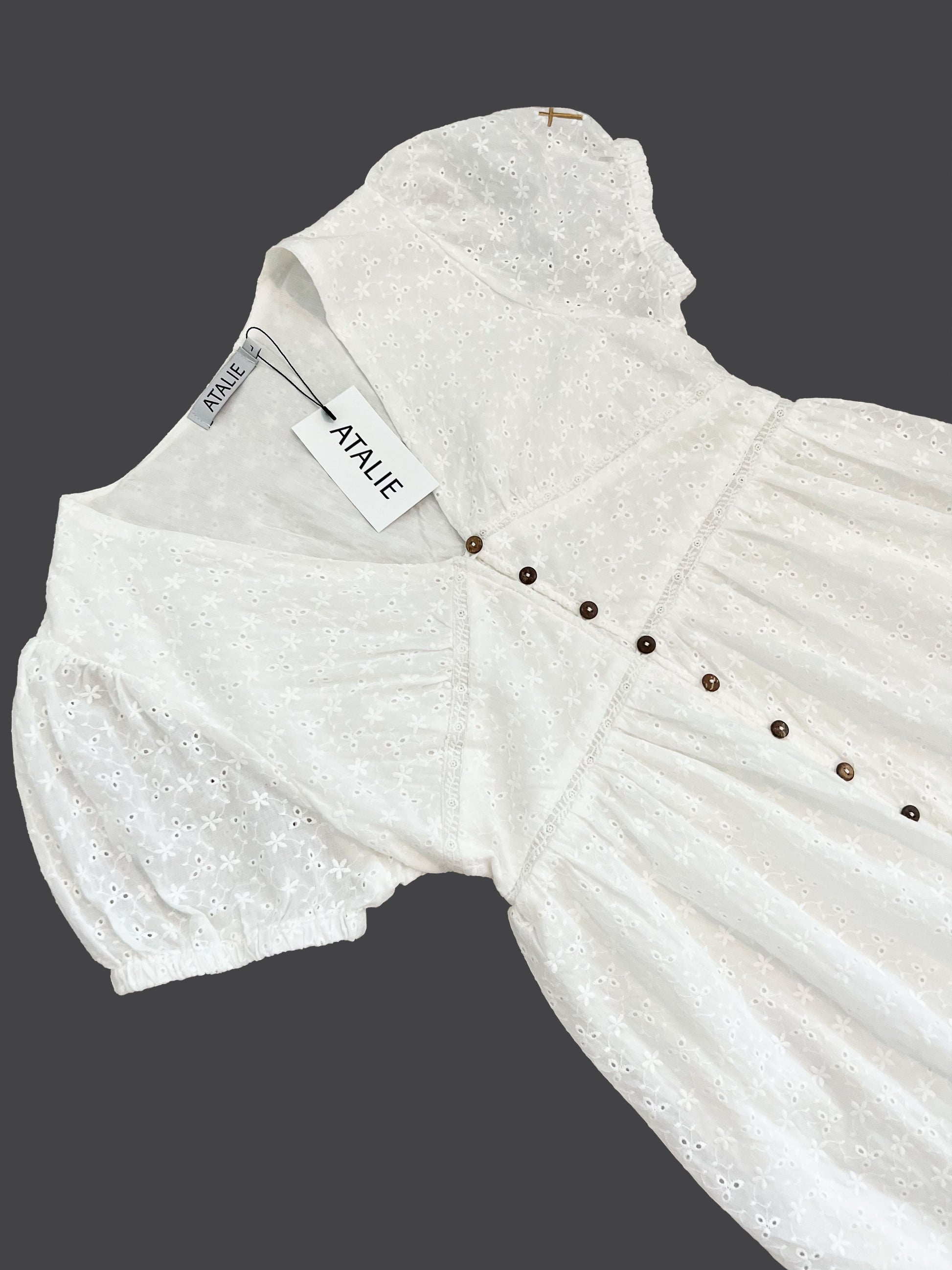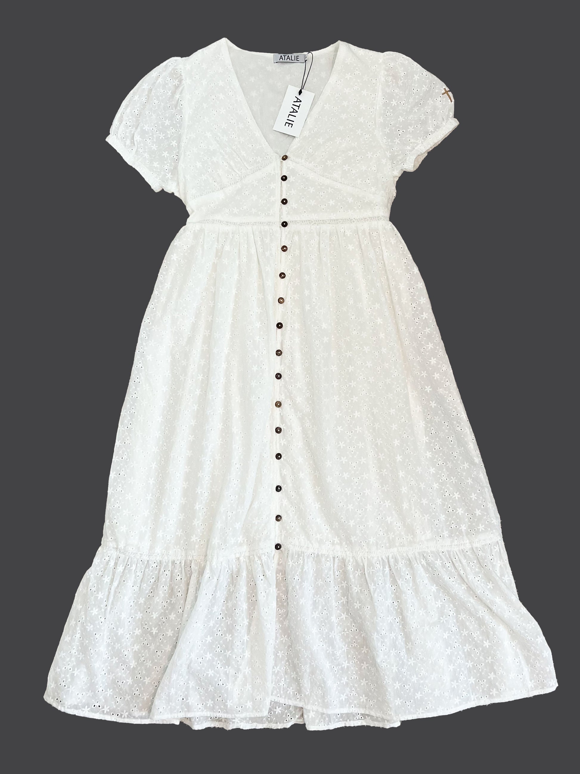 The Grace Dress is an eyelet lace midi dress that feature a button down front, full lining and a smocked back waistband. The embroidered cross can be found on the left sleeve.