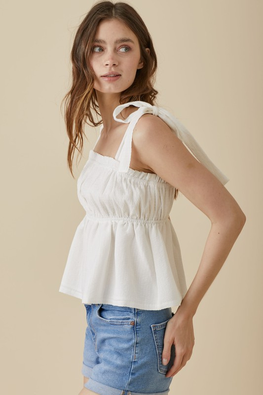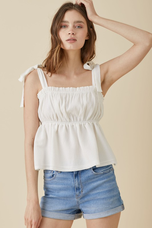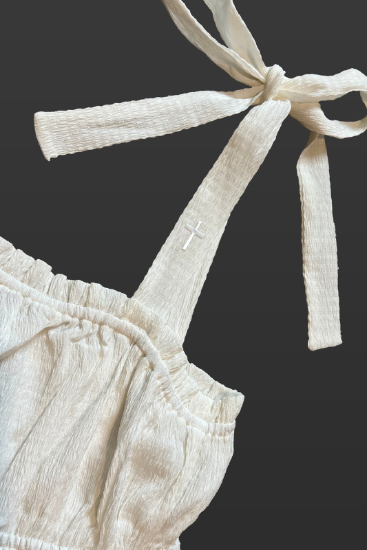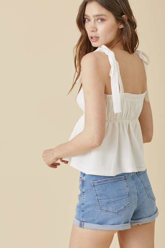 The Naomi Top has a babydoll inspired bodice. The Naomi Top is lined and details include a shirred woven textured cami with tying straps and a ruffled elastic square neckline. Our signature cross can be found on the left tying strap. This top is perfect for the spring and summer!